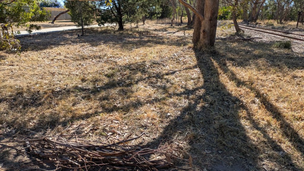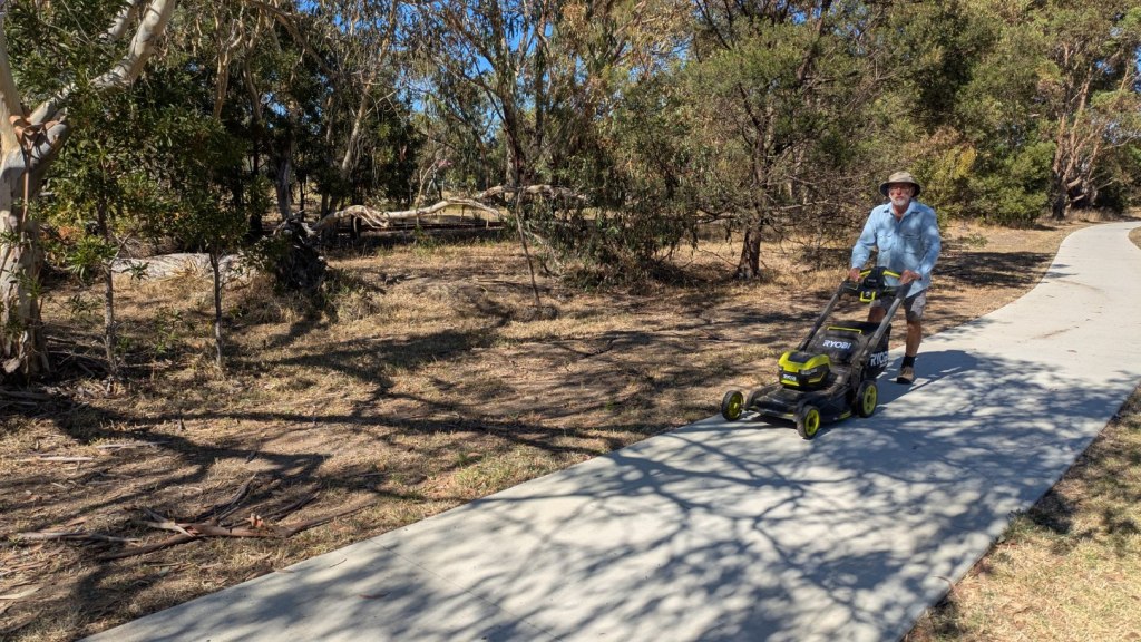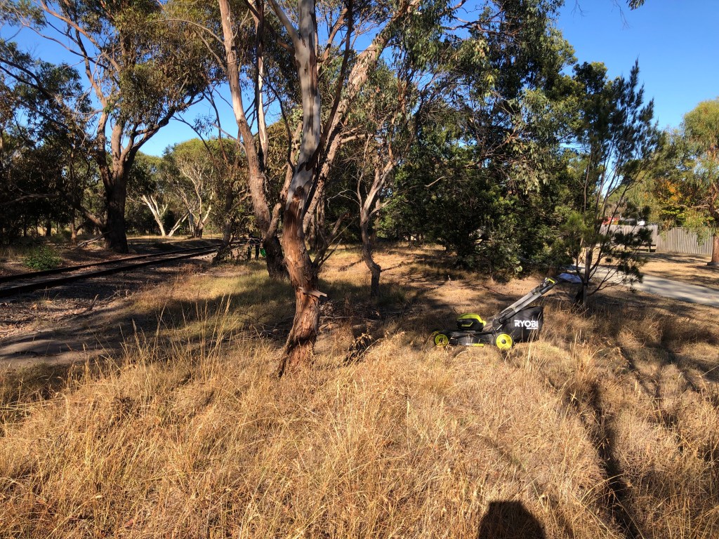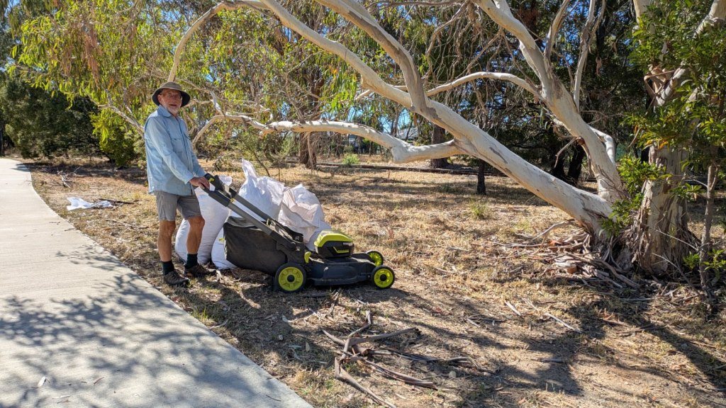 About 600 sq m mowed to promote indigenous germination and growth.Just startingMowings bagged and removedThe Ryobi has done a great jobWhat a beautiful Snow Gum!Mowed looking northMowed around the Snow GumMowed looking southMowed looking southMowed looking north