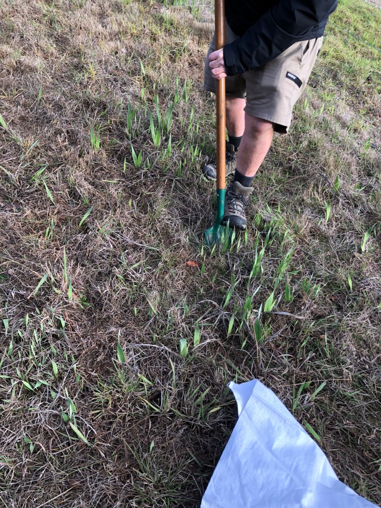 This Tuesday we worked on digging out the emerging Watsonia bulbs at Oakbank crossing. Quite hard going as the ground is dry despite the rain. We will continue to dig them at the next Tuesday working bee.