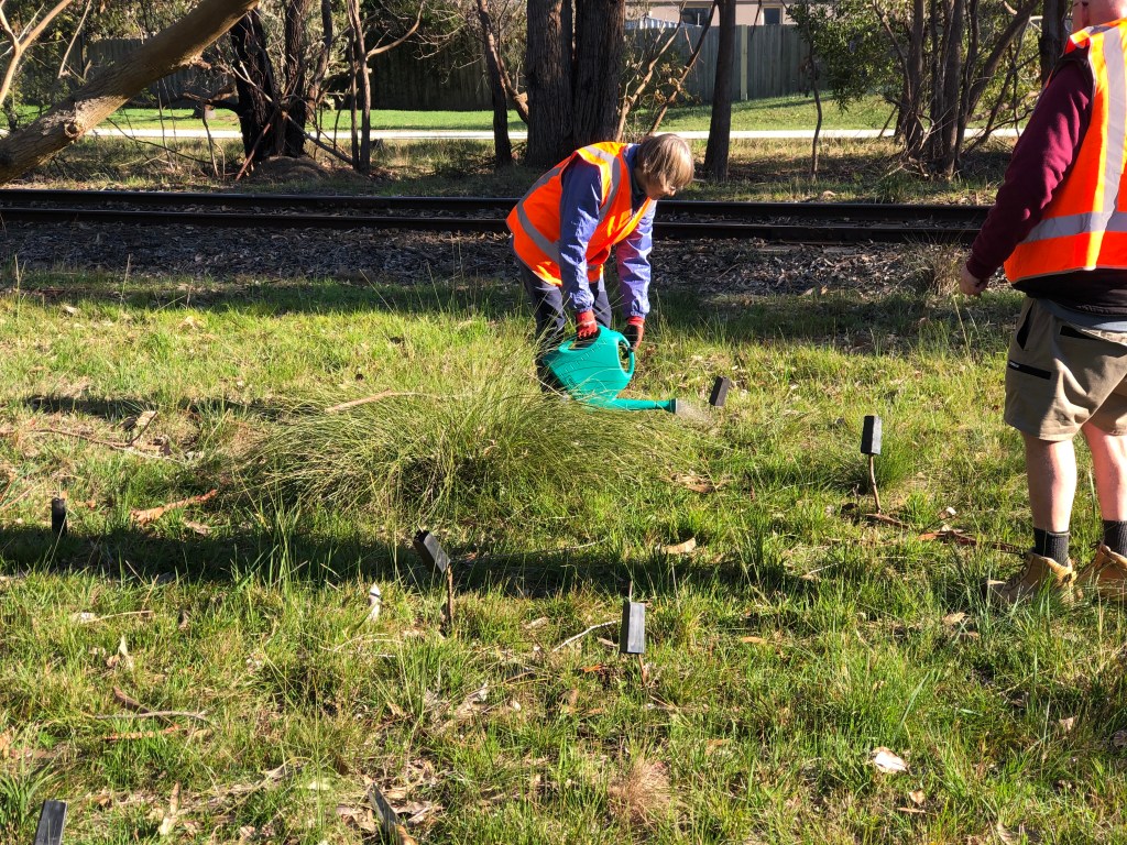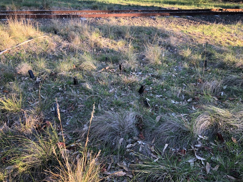 A very satisfying working bee today and into Wednesday. We planted Jeanette’s 46 Podolepis seedlings into five new areas. Hopefully we will be able to boost the population as it had dwindled to just a few plants.