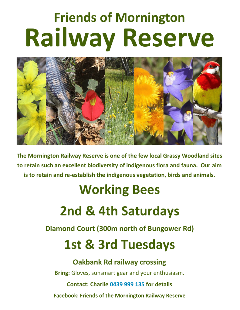 Friends of Mornington Railway Reserve work with the Mornington Tourist Railway to maintain, preserve and enhance the valuable indigenous vegetation along the railway reserve. We welcome new members.